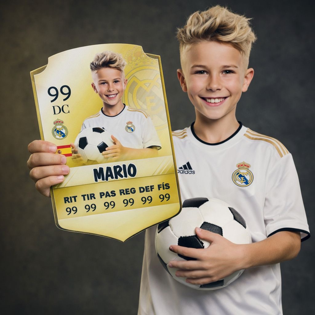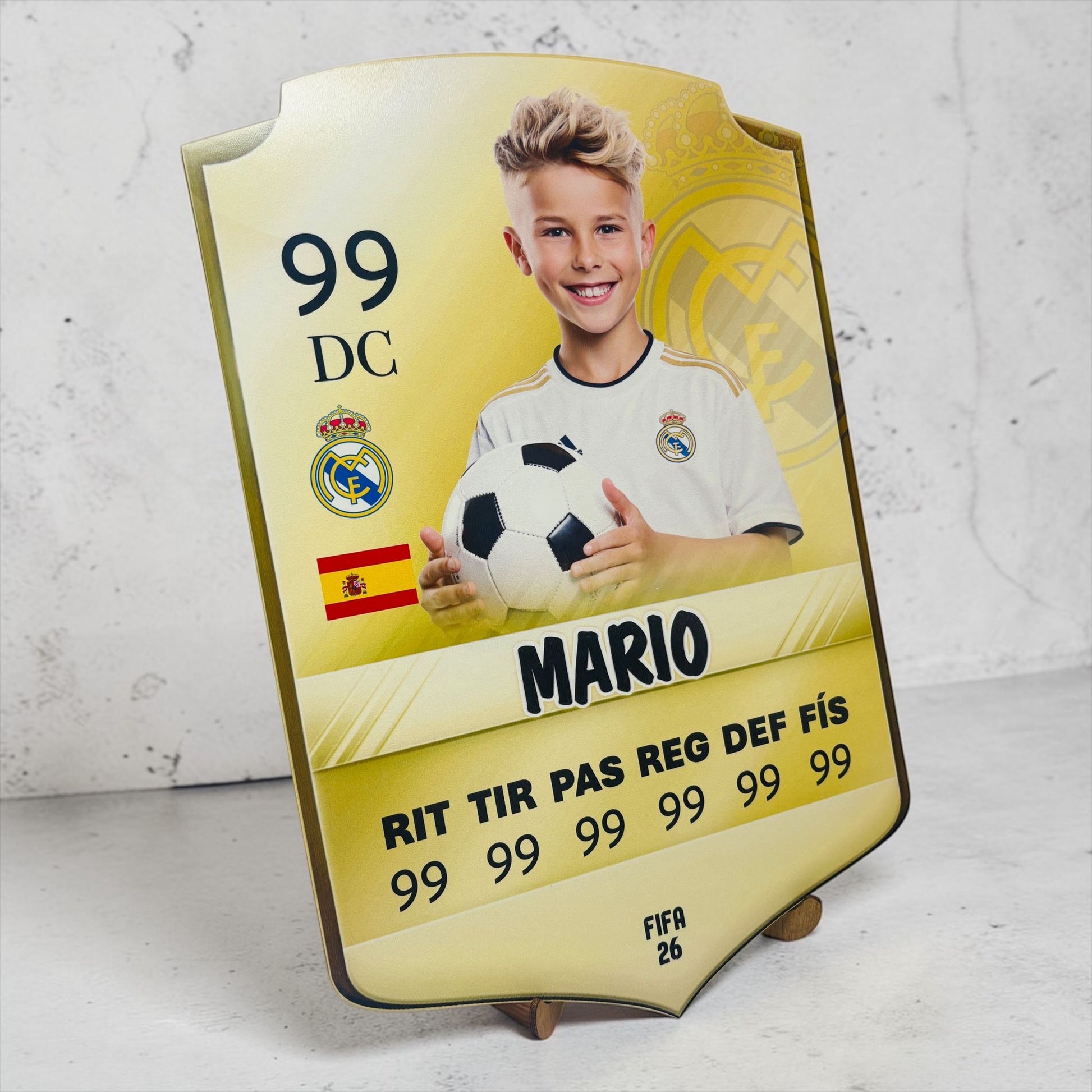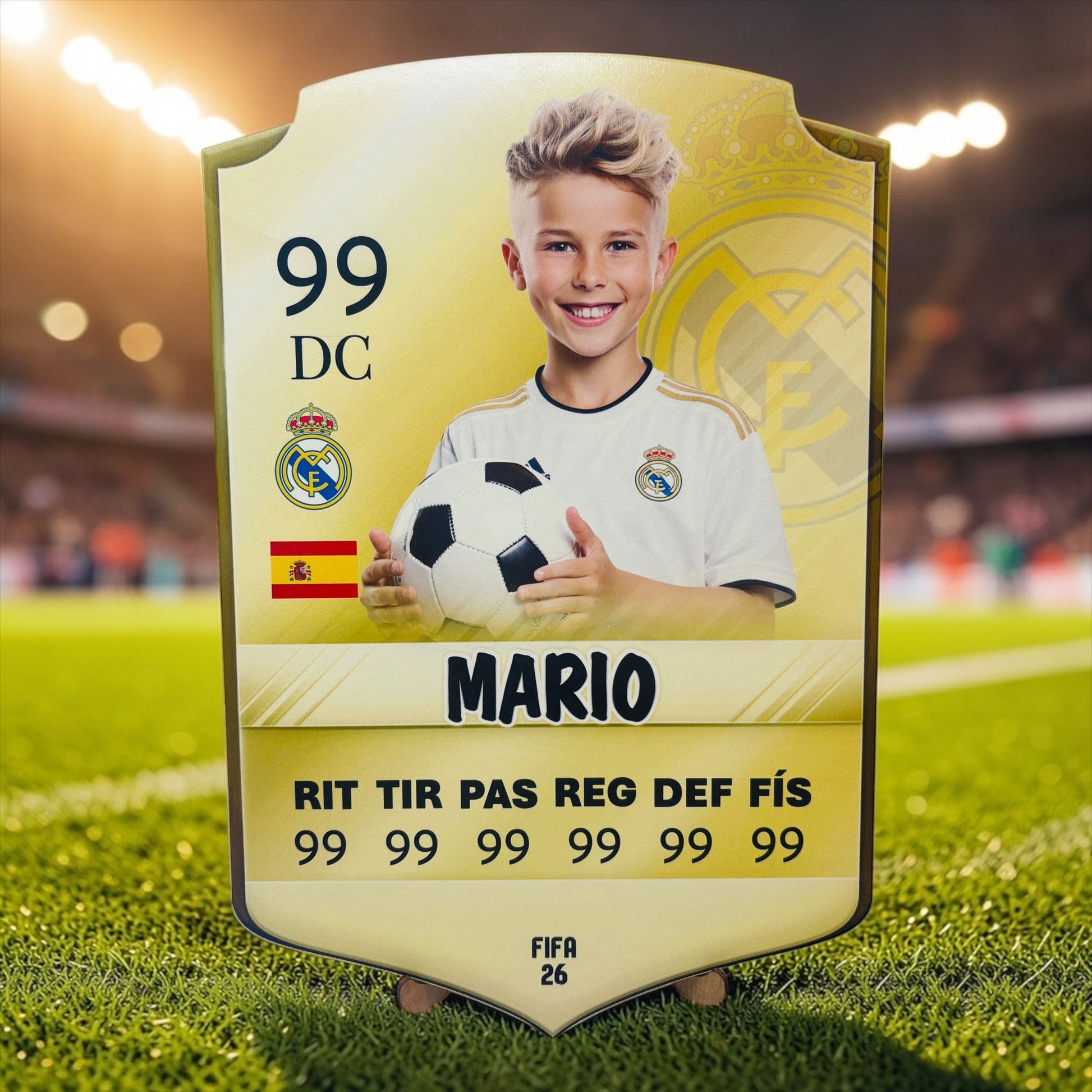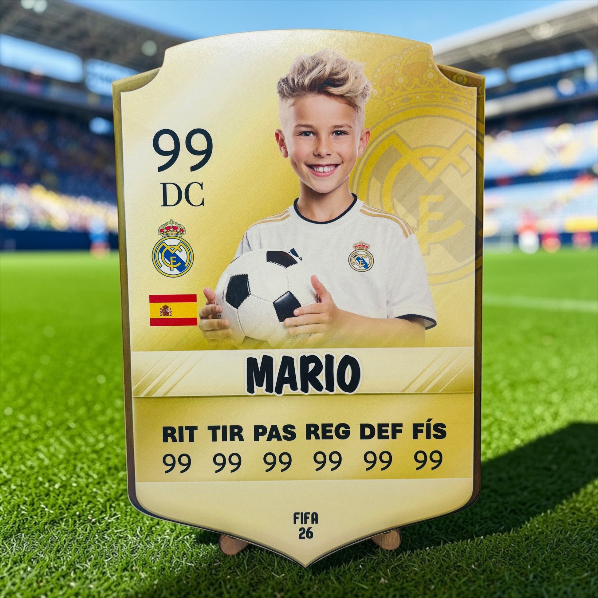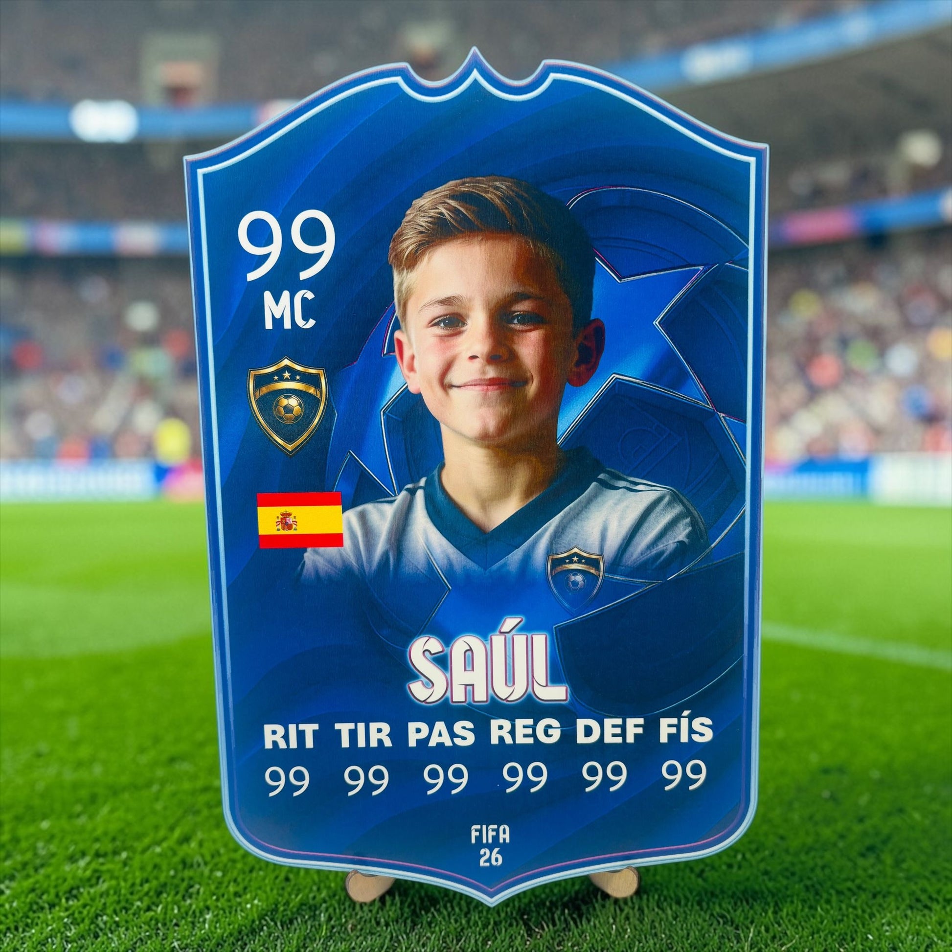 Sorprende con una carta de futbolista personalizada en madera con soporte, un detalle único que convierte a cualquier niño o amante del fútbol en el auténtico protagonista de su propio equipo.