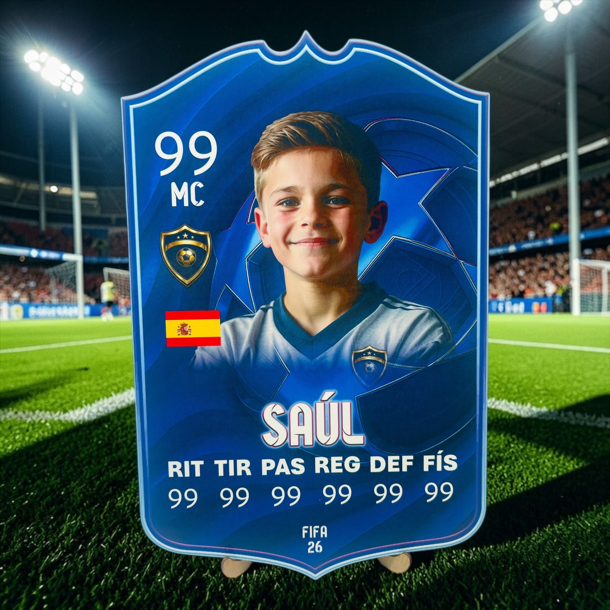 Inspirada en las míticas cartas de fútbol, esta pieza combina diseño moderno, personalización total y un acabado premium que la hace perfecta tanto para regalar como para decorar. Además, cada pieza está hecha a mano, lo que la convierte en un producto aún más especial, cuidado al detalle y con un acabado único.